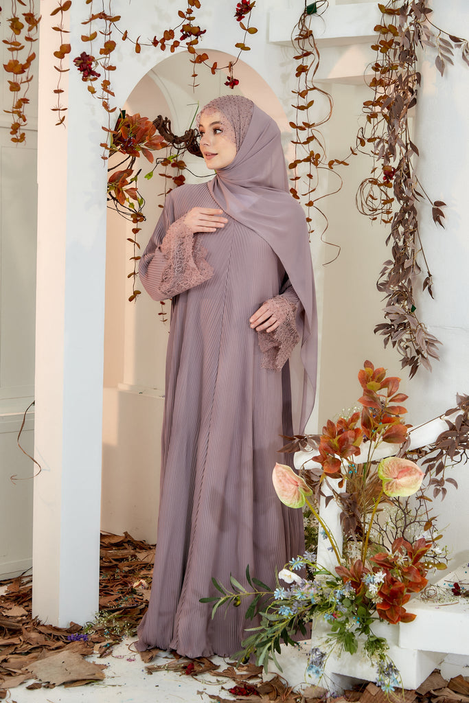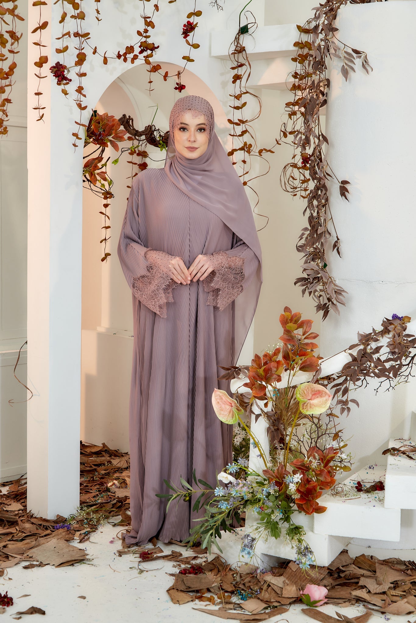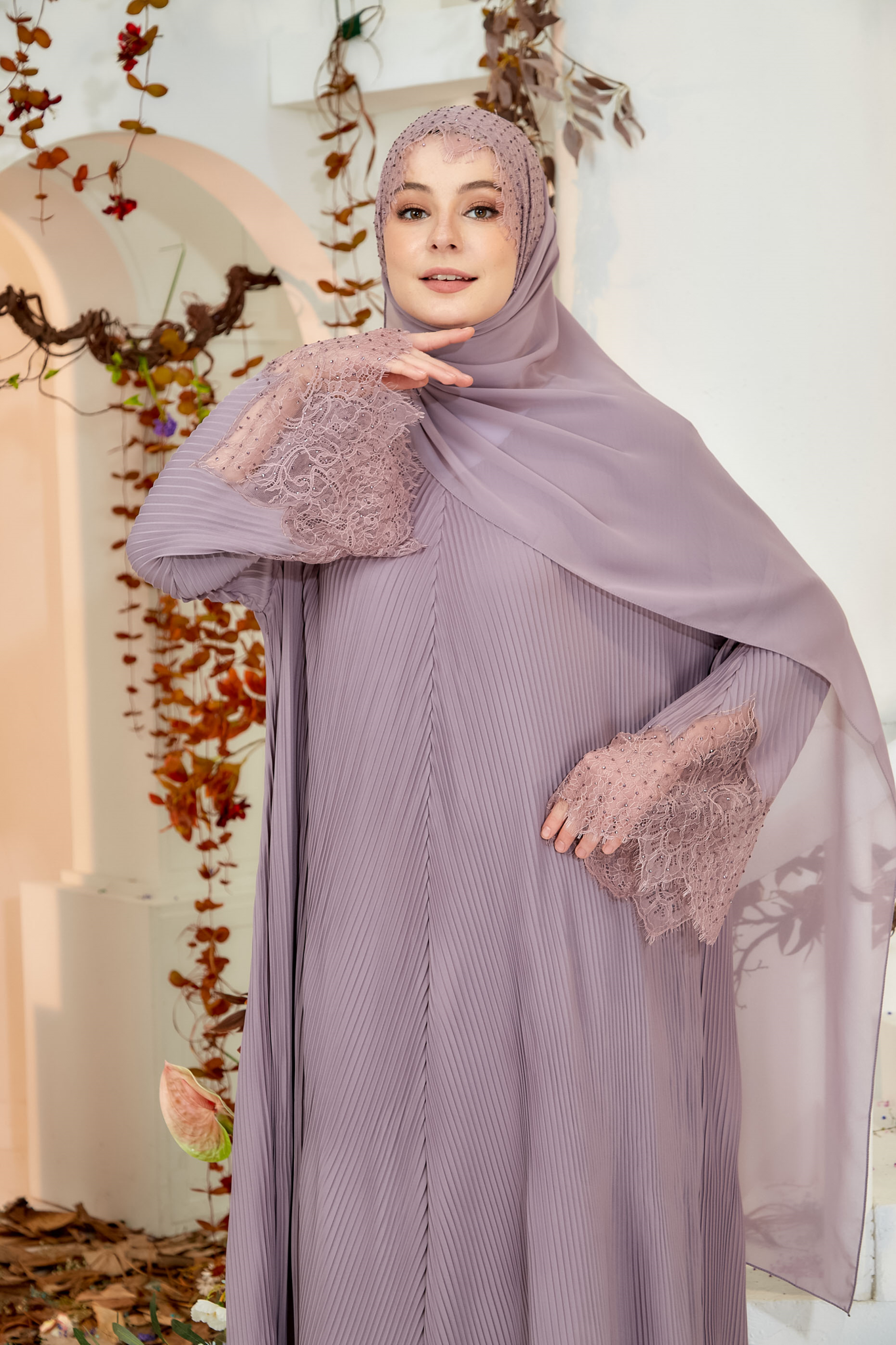 The Fatima Pleated is a sophisticated attire originating from Dubai that showcases a snug A-line pattern with delicate pleats. It is adorned with lace accents on the sleeves and shawl, and is embellished with rhinestones. This premium garment is an ideal option for formal gatherings, weddings, or other dressy affairs.