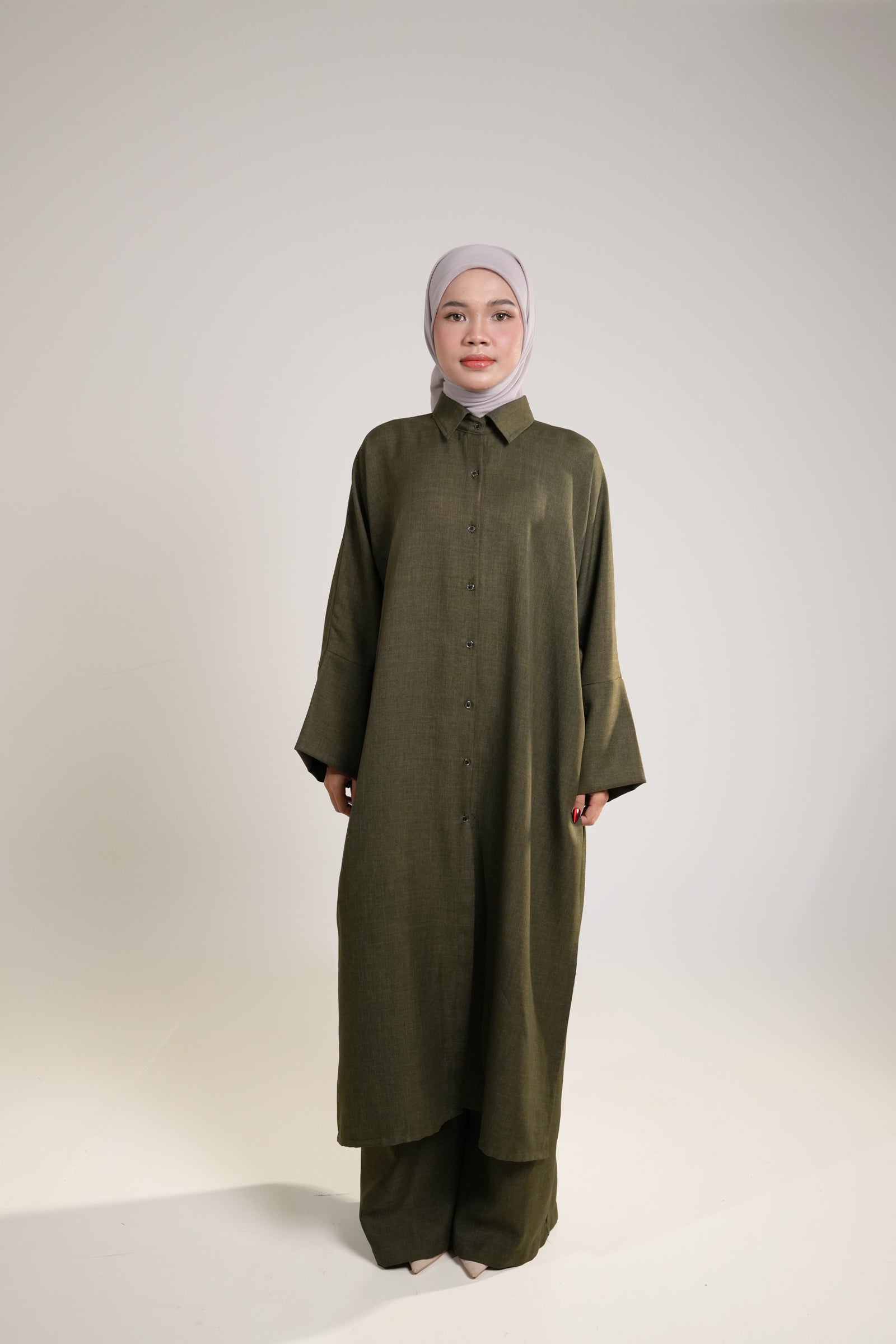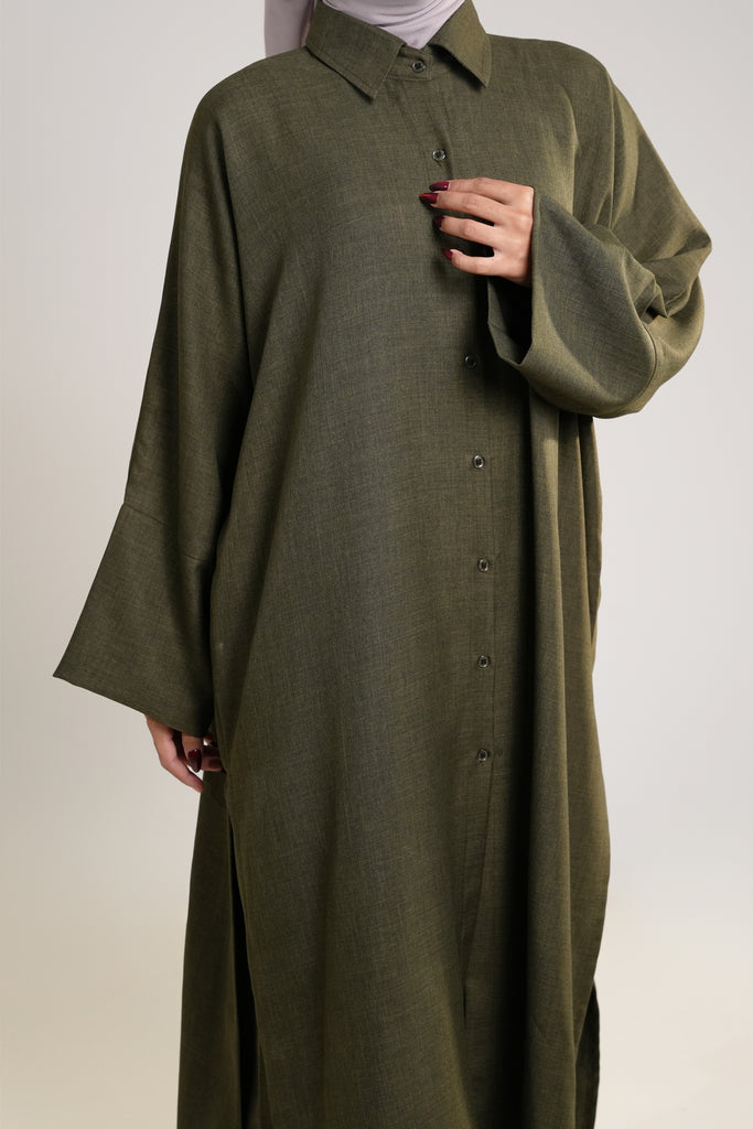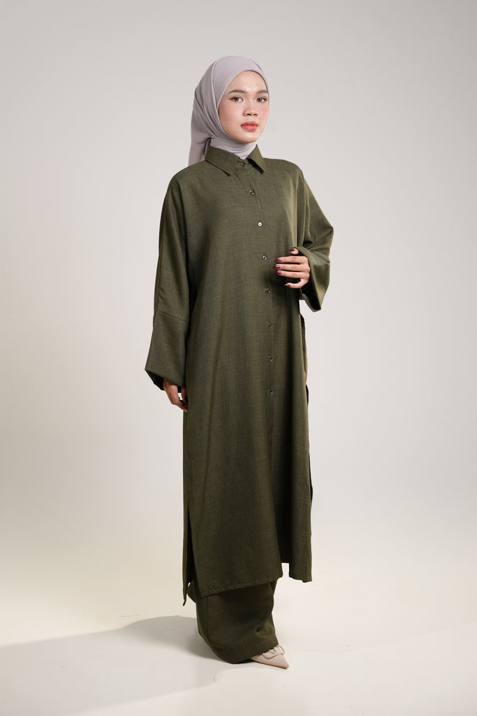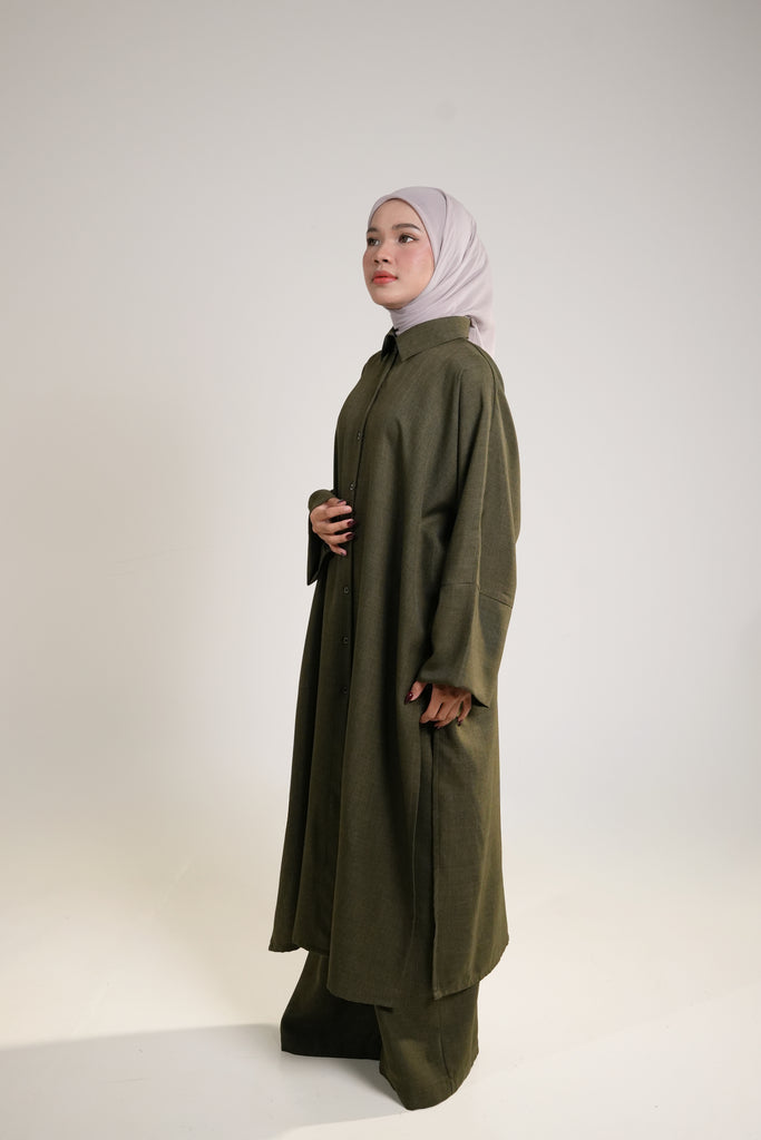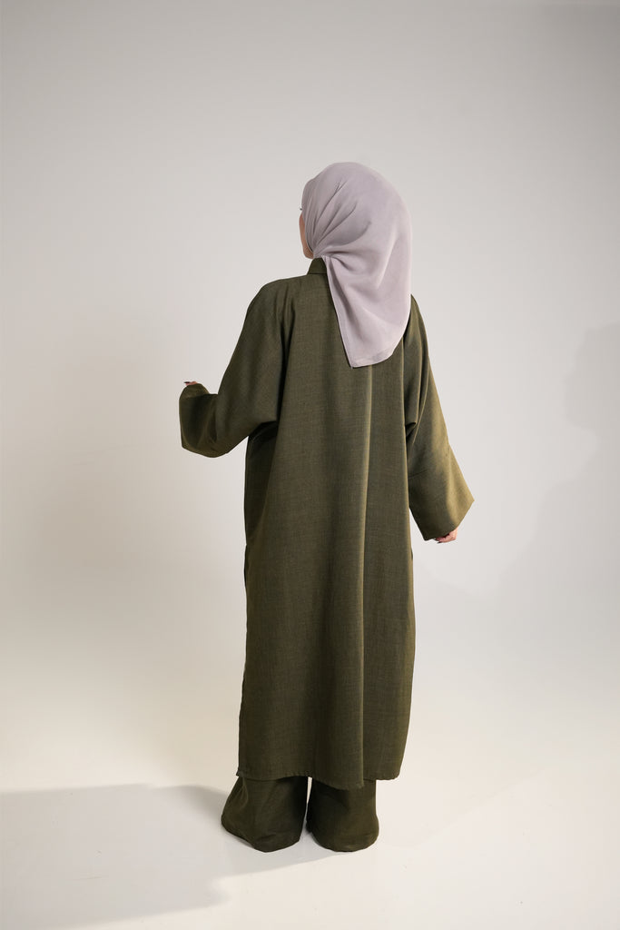 The Naima Kurti in olive green expertly combines style and functionality with its front button closure and coordinating pants. Crafted from breathable cotton linen, it features side openings for easy movement without sacrificing elegance. This comfortable and versatile ensemble is an ideal addition to your wardrobe, suitable for a range of occasions where both comfort and sophistication are essential.
